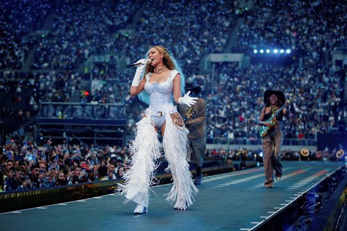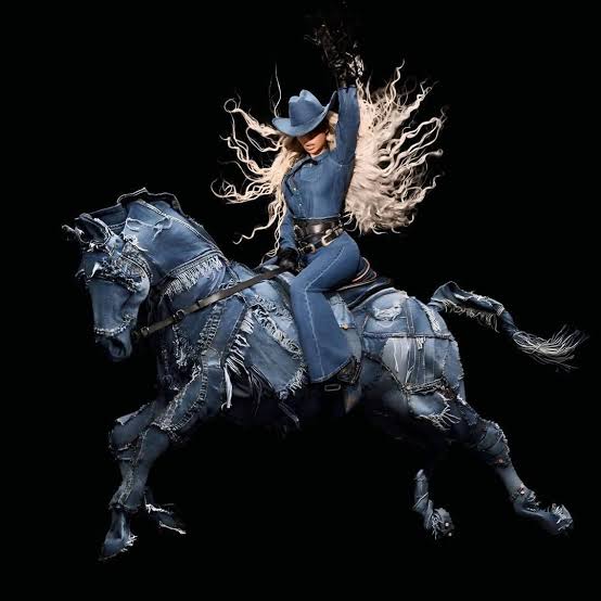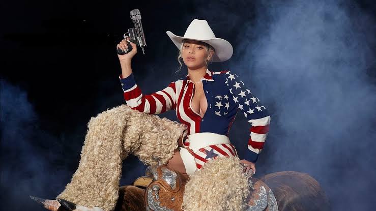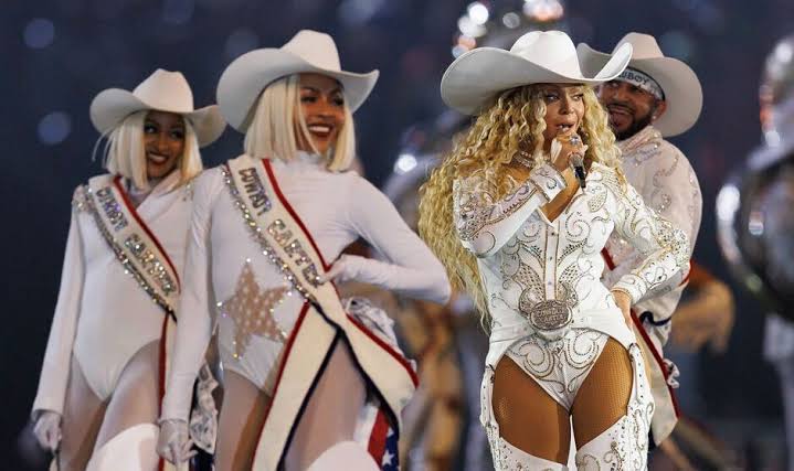 El uso de tejidos como el cuero, la gamuza y el denim, típicos de la indumentaria vaquera, se combina con piezas de alta costura, creando un contraste fascinante. Los detalles metálicos, las franjas y los flecos añaden textura y movimiento, reflejando la energía vibrante de la música. La paleta de colores, que oscila entre los tonos tierra y los vibrantes rojos y dorados, refuerza la estética del oeste americano, pero con un toque de glamour propio de Beyoncé.