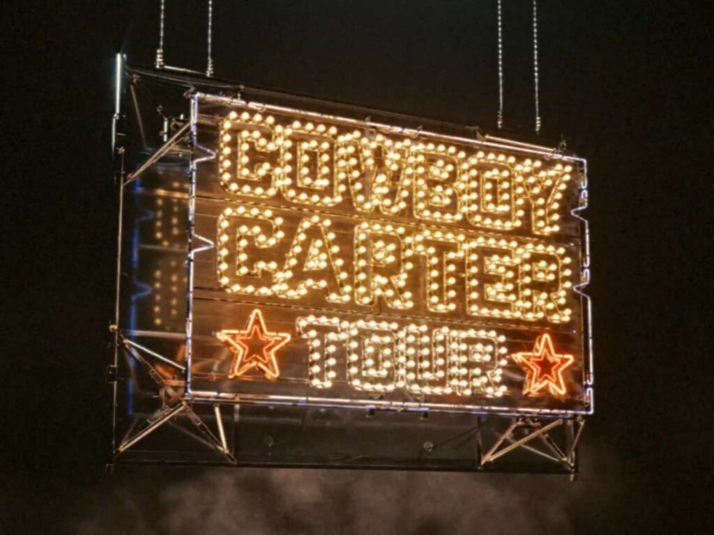 La gira, que arrancó en junio de 2025 en Houston, Texas —su ciudad natal— es la continuación de ese concepto: una declaración de amor por los orígenes y una confrontación elegante a los prejuicios culturales. Beyoncé no solo canta; narra, desafía, honra y transforma. El Cowboy Carter Tour es un espectáculo que combina lo cinematográfico, lo teatral y lo ancestral. El escenario tiene una estética que mezcla rodeo futurista con tradición vaquera: pantallas gigantes, estructuras giratorias, pirotecnia, caballos mecánicos, fuegos de campamento, cruces con neon y una ambientación del viejo oeste reinterpretado con mirada afrodescendiente.