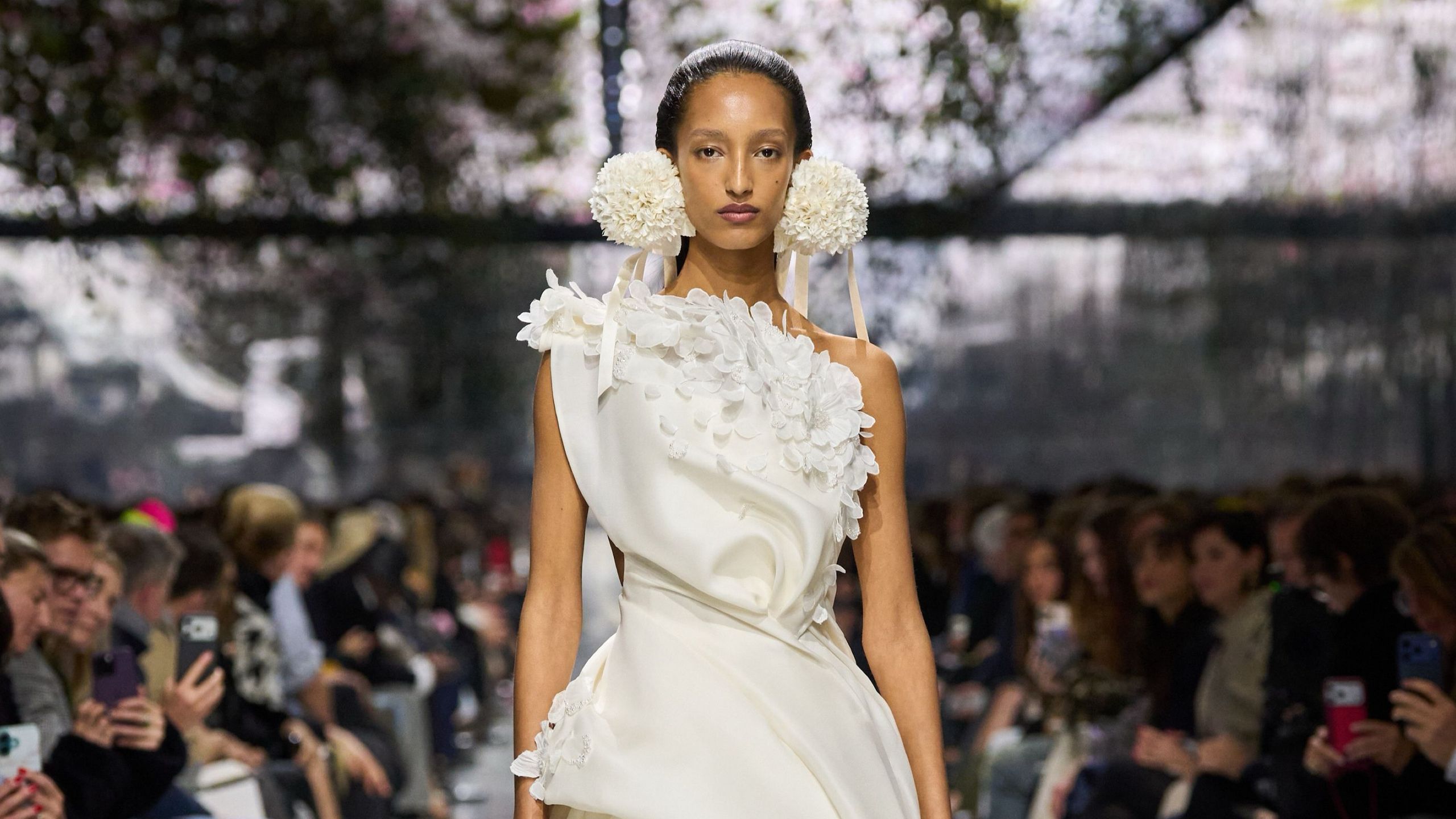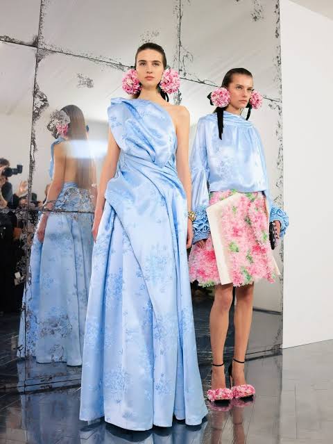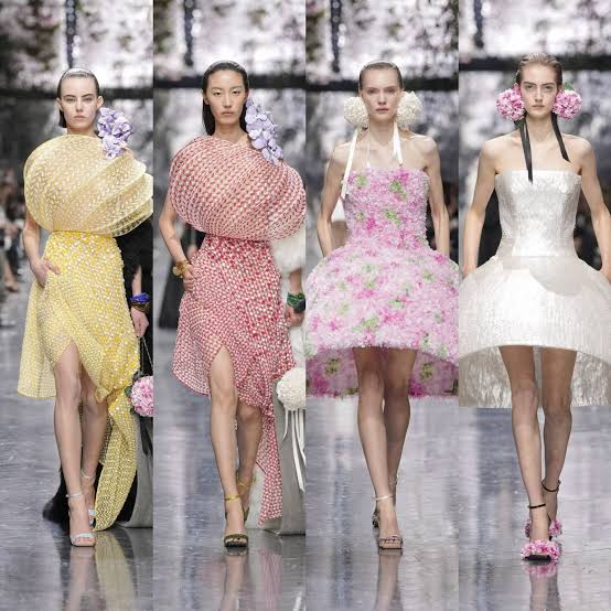 La estética general es ligera y femenina, con telas suaves como sedas, tules y organzas trabajadas con bordados delicados hechos a mano. Los motivos naturales aparecen de forma sutil, como pétalos en la seda, ricami densos o elementos en los accesorios, evocando metamorfosis más que formas definidas. La paleta de colores se centra en tonos claros y suaves, reforzando la sensación de sofisticación y ligereza. La colección fue bien recibida como el comienzo de una nueva etapa creativa para la firma, que mantiene la elegancia clásica de Dior mientras la acerca a un público más moderno.