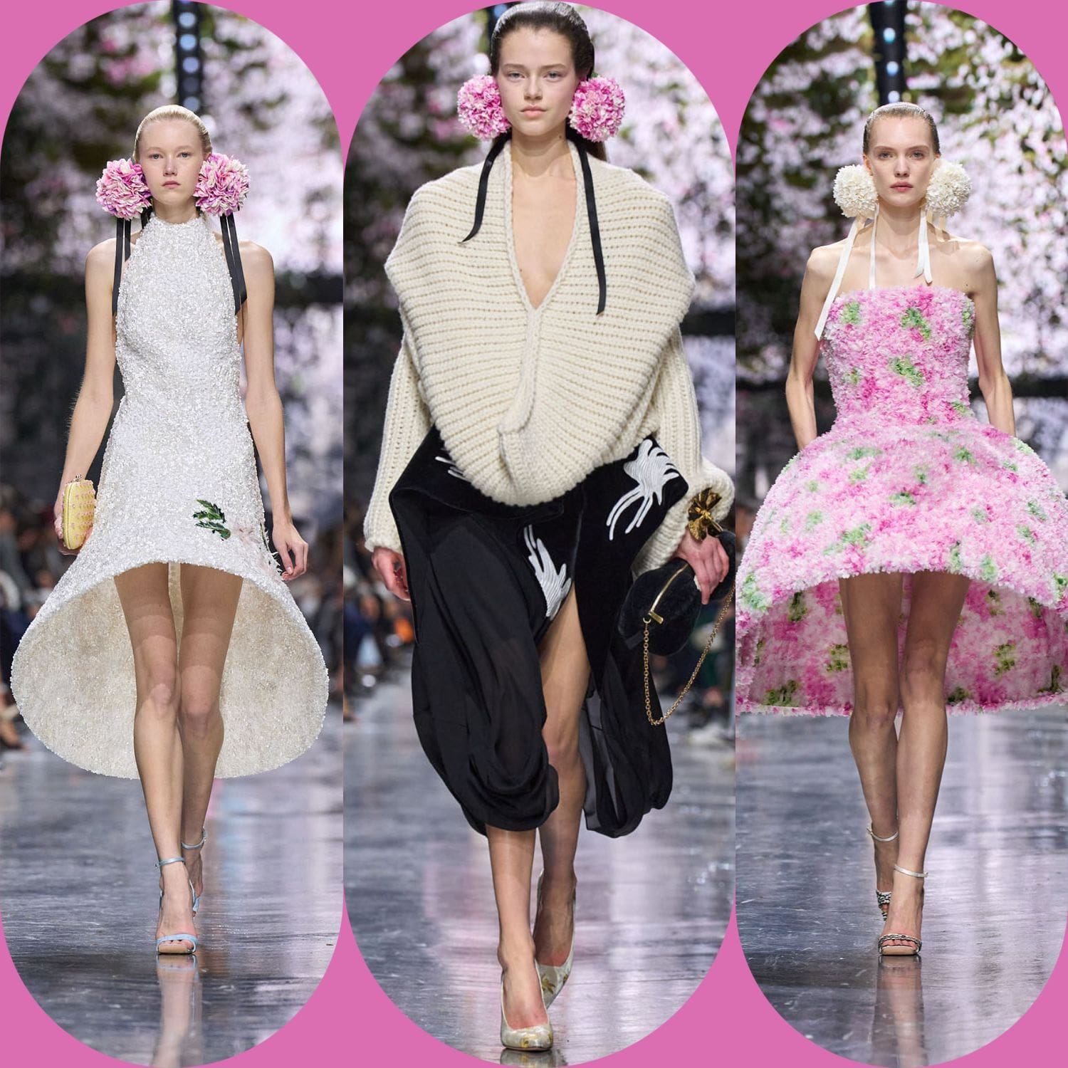 La propuesta creativa se desarrolló en un espacio con un techo vegetal de muschio, hierbas y ciclamini, creando un ambiente conceptual que evocaba una cámara de maravillas contemporánea. Las siluetas son amplias y fluidas, con faldas que se expanden como volúmenes de aire y vestidos de noche que diseñan el espacio alrededor del cuerpo. Los materiales como el chiffon, las organzas desfrangadas y el crochet se utilizan de manera estructural, demostrando cómo la artesanía puede convertir la delicadeza en arquitectura. Además, la colección rinde homenaje a la historia de Dior al incorporar siluetas icónicas de Christian Dior, referencias a Yves Saint Laurent, John Galliano y Maria Grazia Chiuri, mientras introduce elementos modernos como la magliería en el vocabulario couture y borse realizadas con tejidos del siglo XVIII o reinterpretaciones del Lady Dior.