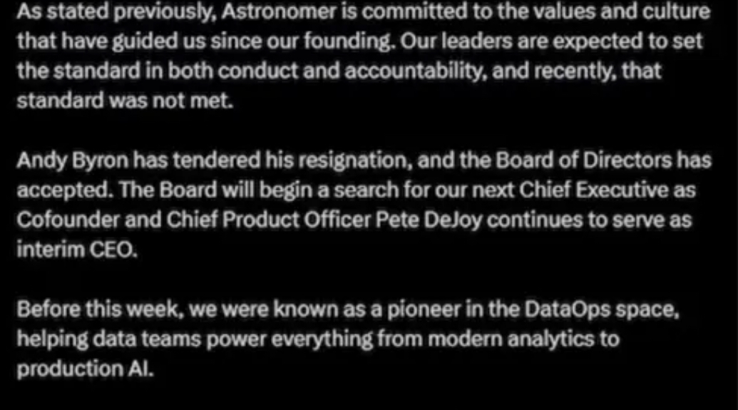 En un comunicado, Astronomer, que se describe como la principal plataforma unificada de DataOps, informó: “Andy Byron ha presentado su dimisión y el Consejo de Administración la ha aceptado. El Consejo iniciará la búsqueda de nuestro próximo director ejecutivo, mientras que el cofundador y Director de Producto, Pete DeJoy, continúa como director interino”.