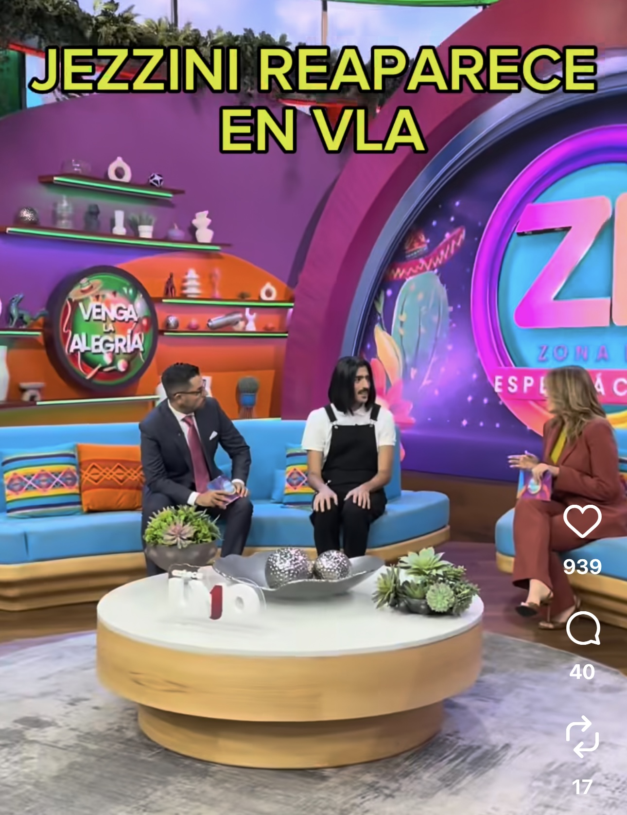 El 9 de septiembre marcó el regreso de Jezzini a la pantalla. El influencer apareció en Venga La Alegría con un look llamativo: peluca negra, camiseta blanca y overol del mismo tono oscuro. Durante su intervención lanzó un mensaje directo al público “México, estoy bien, me llamo Zinni y me encantó el episodio de Katy Perry”.