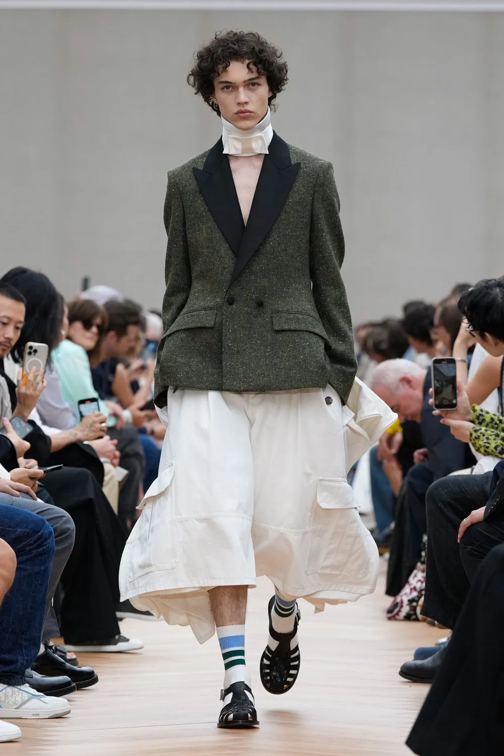 Anderson recurrió a la elegancia —o solemnidad— del siglo XVIII y la reinterpretó con pragmatismo contemporáneo. Mezcló la rigurosidad aristocrática (chalecos brocados, corbatas ceremoniales, tweeds Donegal) con detalles preppy e incluso subtleties “boyish”: shorts cargo amplios, suéteres de rugby, prendas de punto cable y cuellos Oxford elevados al estilo Regencia británica .