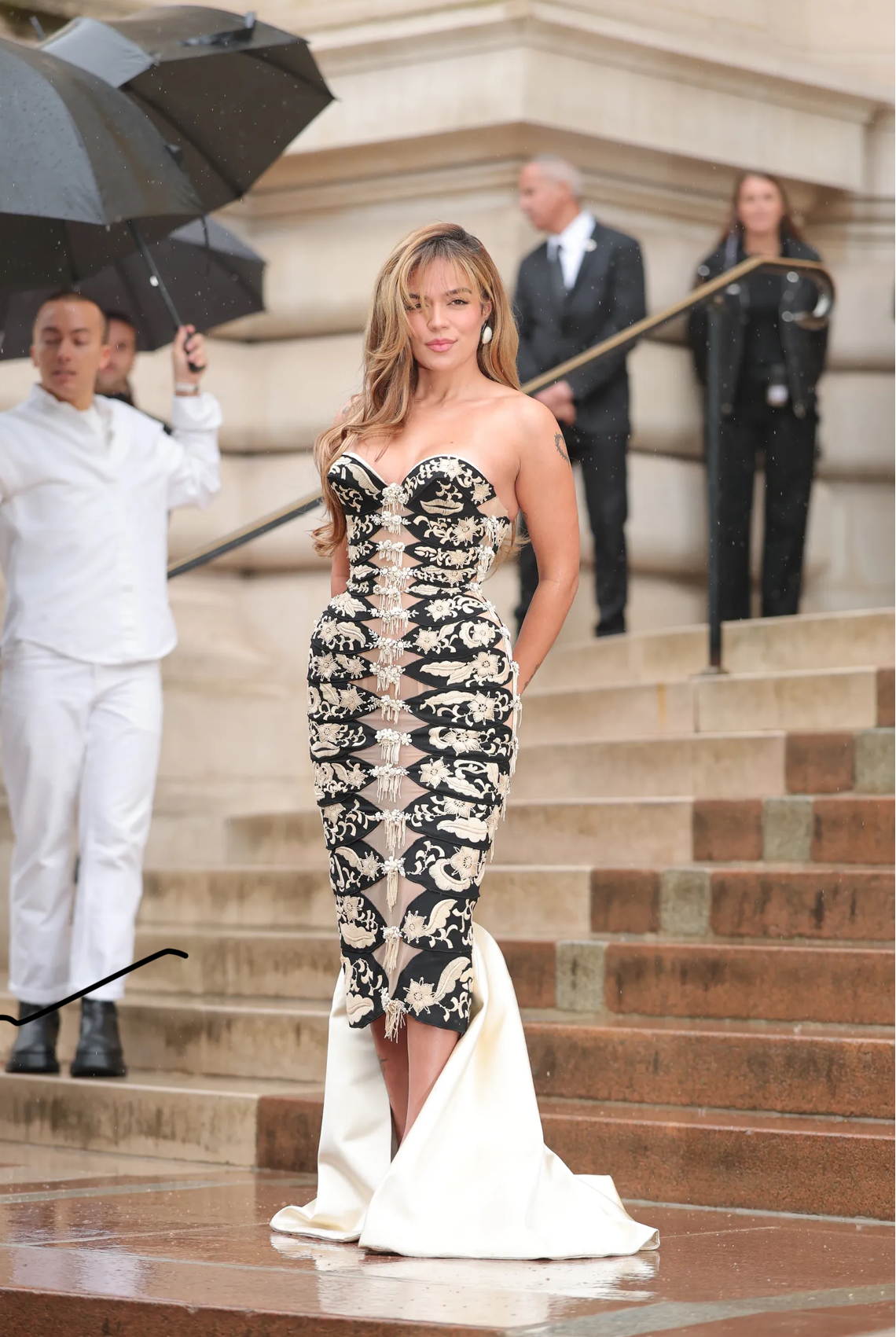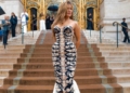 Llegó al desfile con un vestido que seguía esta misma línea y destacaba su figura. En concreto, un diseño de la última colección de alta costura de la firma y confeccionado para la temporada de Primavera 2025, en blanco y negro, cuenta con detalles florales bordados a lo largo del torso y la falda, además de los motivos surrealistas donde se encuentran ojos o labios clásicos de Elsa Schiaparelli. Sin embargo, una de las claves de este vestido es su escote corazón, favorecedor al extremo y capaz de destacar el torso de forma elegante la silueta. Desde luego, un escote a tener en cuenta y que se suma a los halter que ya han enamorado a las que más saben de moda este verano.