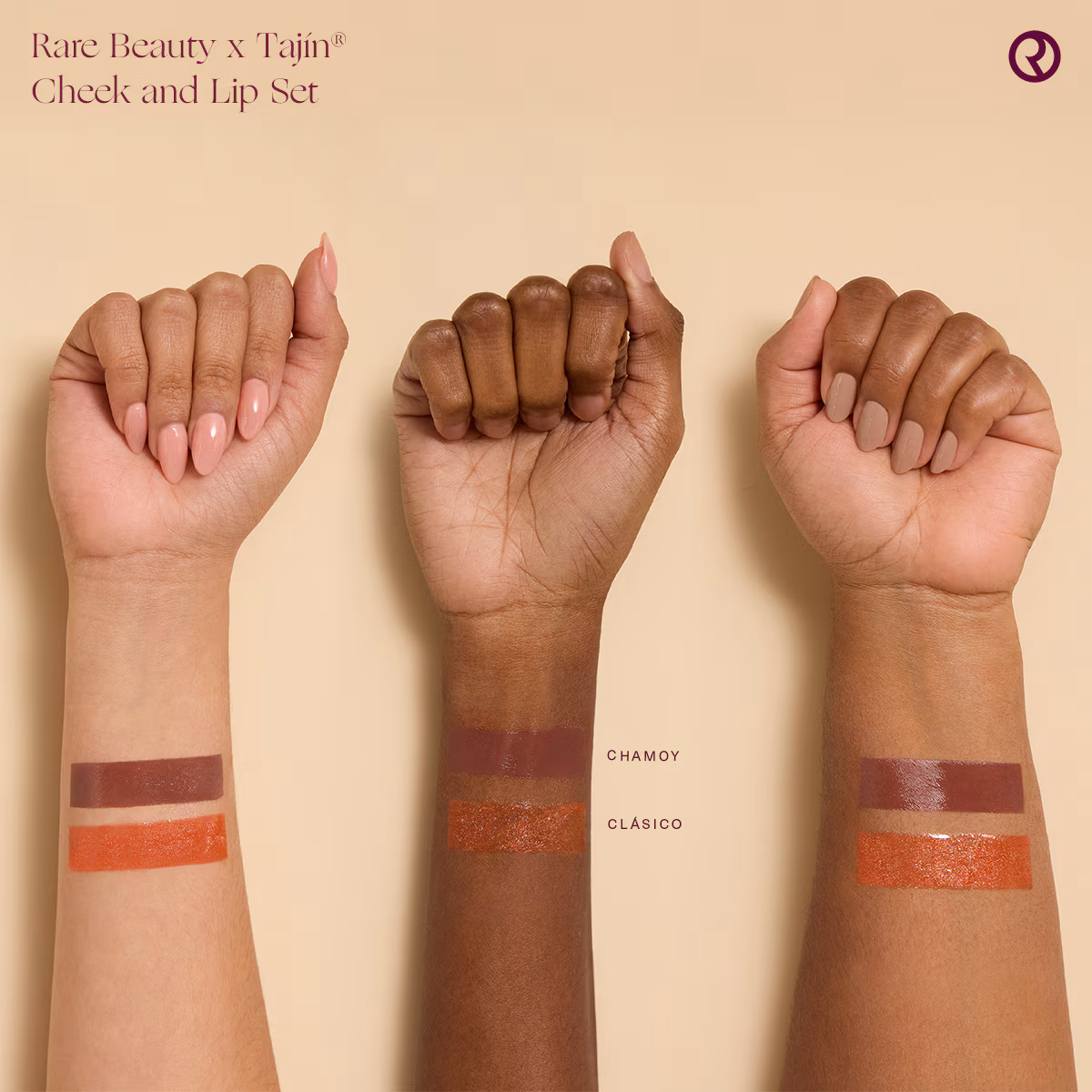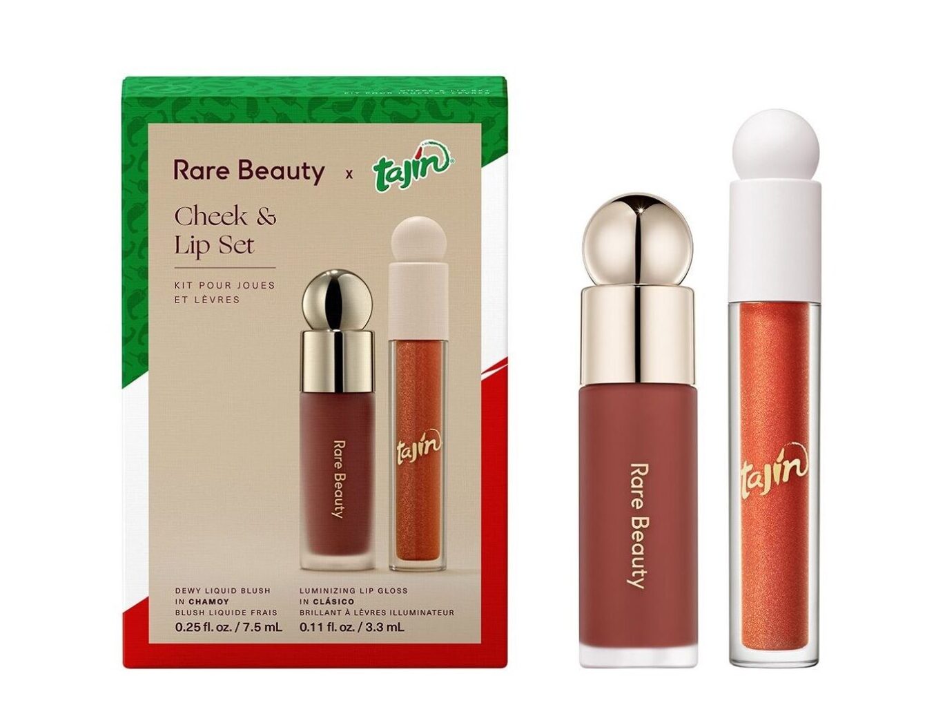 El Rare Beauty x Tajín Cheek & Lip Set incluye dos piezas tamaño completo: el Soft Pinch Liquid Blush en tono Chamoy, un rojo marrón intenso, y el nuevo Positive Light Luminizing Lip Gloss en tono Clásico, un terracota con destellos dorados y cobrizos. El kit cuesta US$30 y está disponible hasta agotar existencias. En México se vende también en Sephora México por aproximadamente 730 pesos