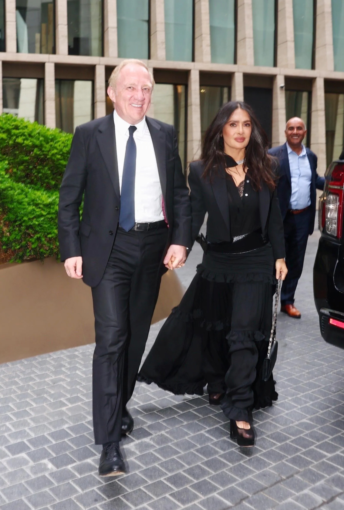 Salma Hayek llevó el look al siguiente nivel con unos zapatos de plataforma que distan de estar entre los modelos más clásicos. Lució un diseño de calzado transparente, de tacón cuadrado y con una evidente plataforma, que marca un antes y un después en la tendencia de los zapatos de rejilla y de mesh.