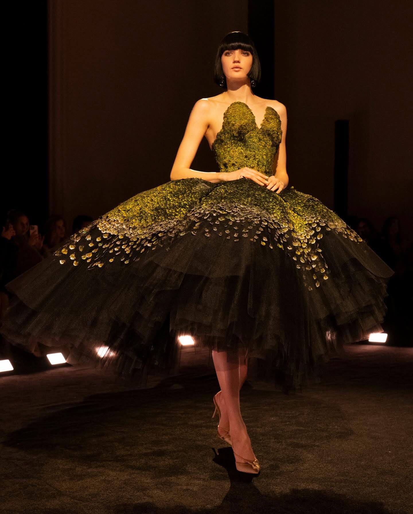 Los diseños destacaron por su trabajo artesanal extremo y referencias a la naturaleza y el arte. Entre las piezas más emblemáticas se encuentra un vestido sereia que requirió más de 8 mil horas de trabajo, con un corset en el que se mezclaron 27 tonalidades de azul y una barra adornada con 65 mil penas falsas aplicadas una a una. También sobresalieron looks con bordados en relieve, siluetas escultóricas, y criaturas fantásticas como «infantas terribles» –aves, reptiles y arácnidos– con plumas reales y de seda pintadas a mano, aerografiadas o bañadas en resina y cristales. Elementos como flores que desafían la gravedad, púas en cuellos y hombros, y un traje llamado «Isabella Blowfish» con detalles de pez globo completaron la propuesta, que evocó la fascinación de Elsa por la vida animal.