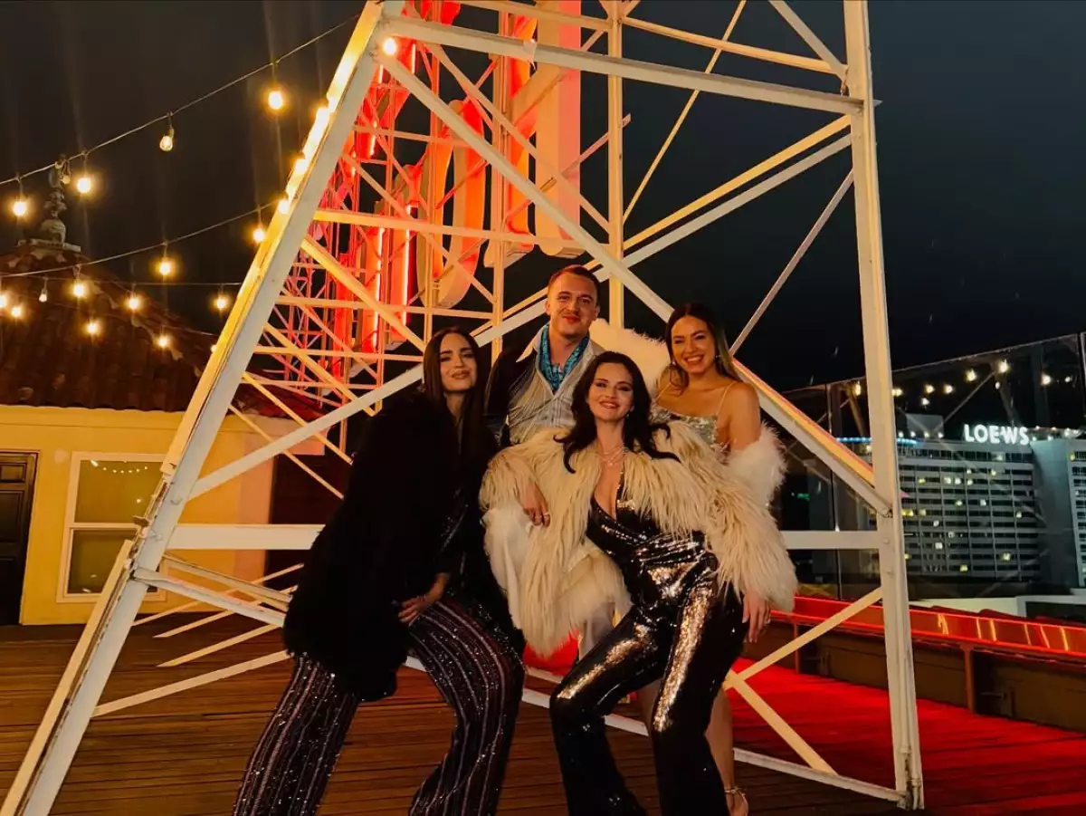 El lugar elegido fue la elegante terraza de un hotel top en Hollywood, con luces colgantes y decoración metálica que reforzaban el mood vintage y chic del evento. El detalle del rooftop no solo conectó con la vibra de los 70, sino que añadió ese toque VIP que esperaba su círculo cercano.